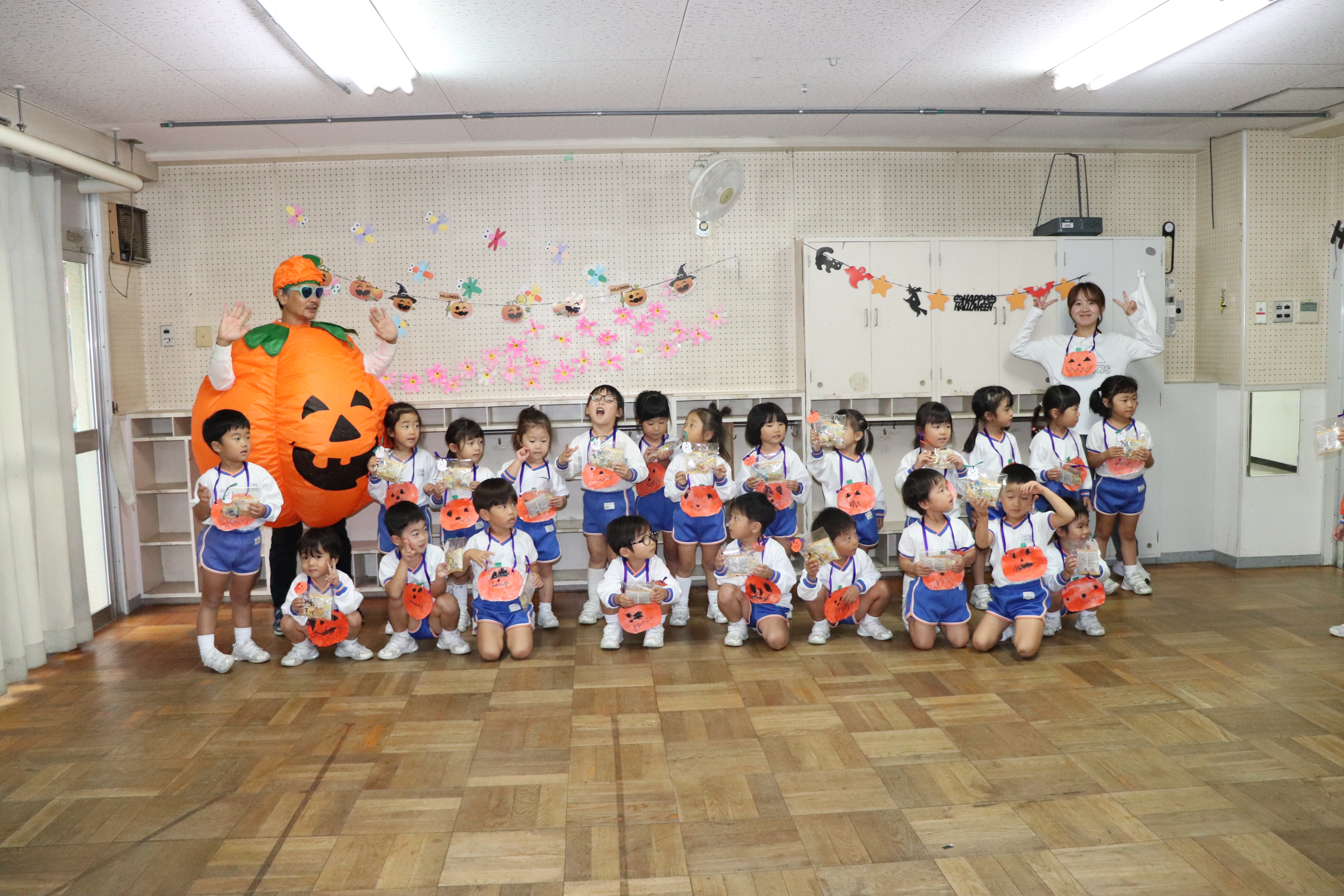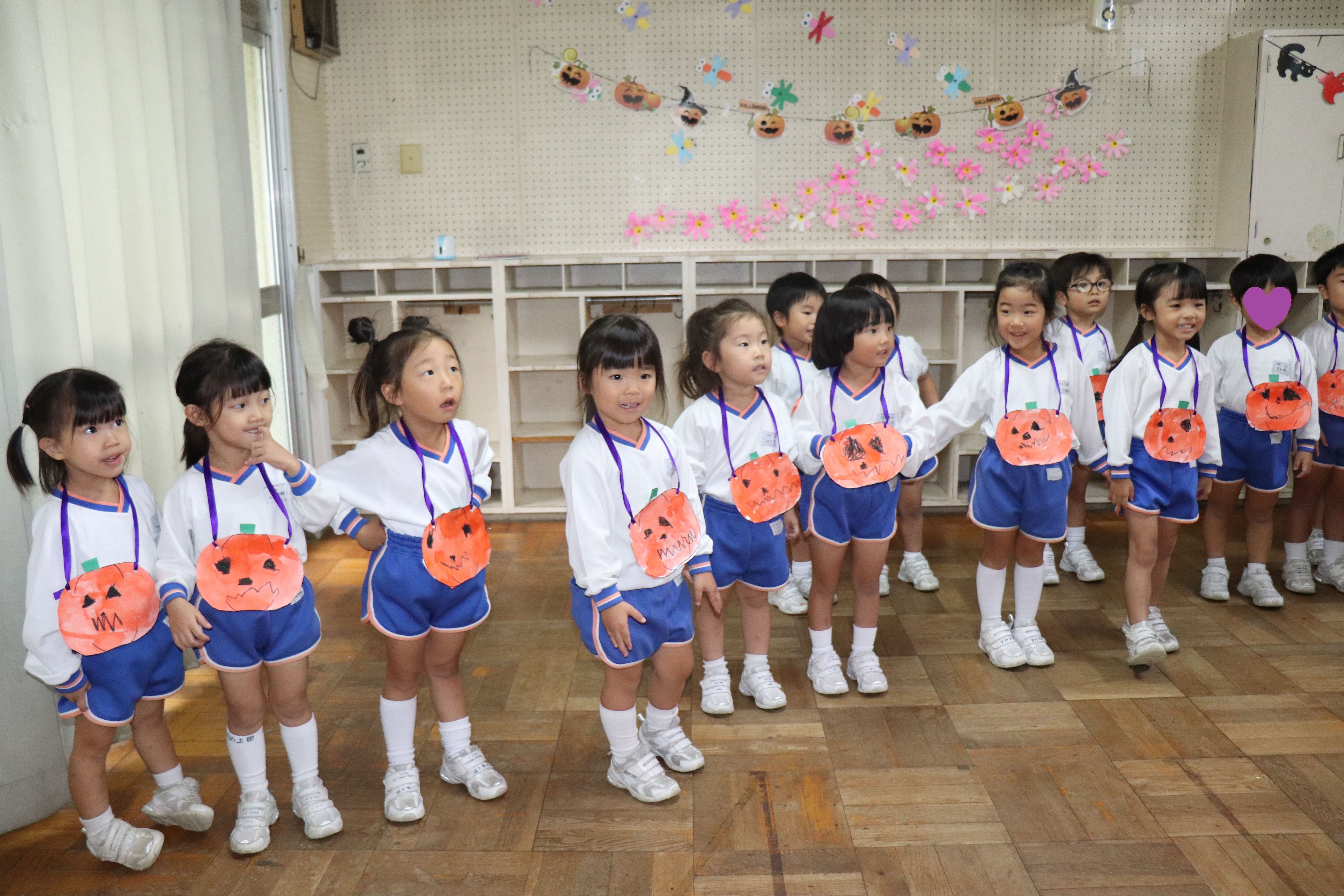 ハッピーハロウィン 2025.11.7 各クラス、ハロウィンの制作や衣装を身に着け、かぼちゃマンと楽しく踊って盛り上がりました!ハッピーハロウィン! 年長 月組 年長 星組 光組 さくら組 すみれ組 ひばり組 つばめ組 かもめ組 もも組 【もも組・年少組】運動発表会を行ないました。 園庭開放、楽しかったね